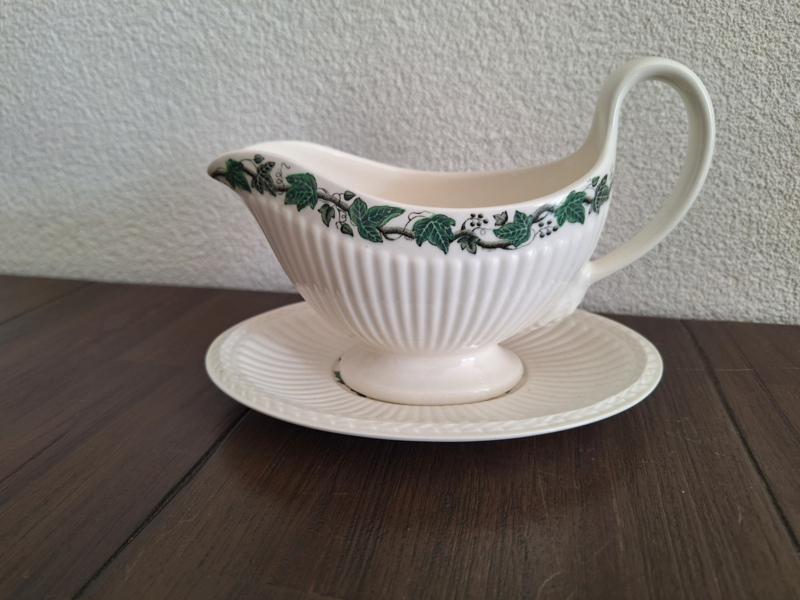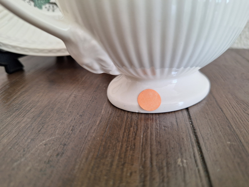 Helaas heeft deze sauskom een heel kleine beschadiging op de voet van de sauskom, op de foto gemarkeerd met een oranje stip.